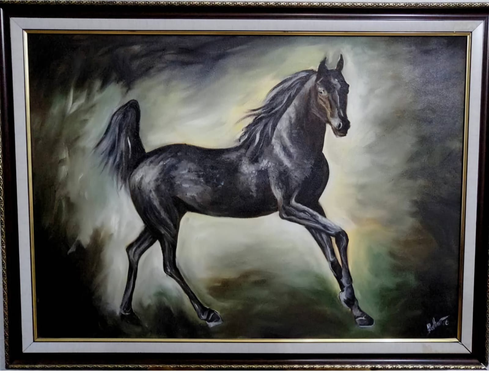 Bu etkileyici yağlı boya çalışması, karanlık fon üzerinde öne çıkan siyah bir atın zarafetini ve gücünü yansıtır.