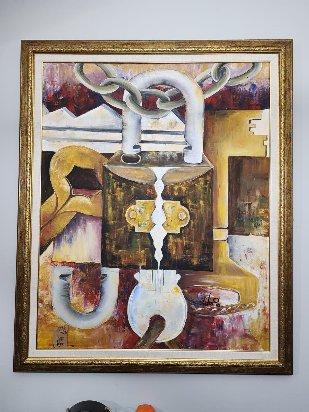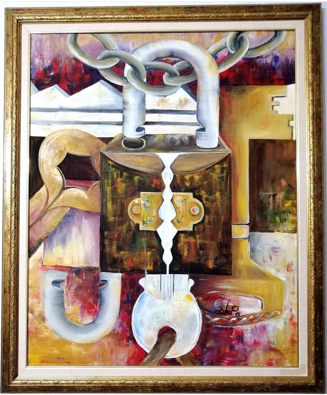 Tablonun odak noktasında yer alan büyük kilit, dış dünyadan saklanan bir içsel dünyayı temsil eder.